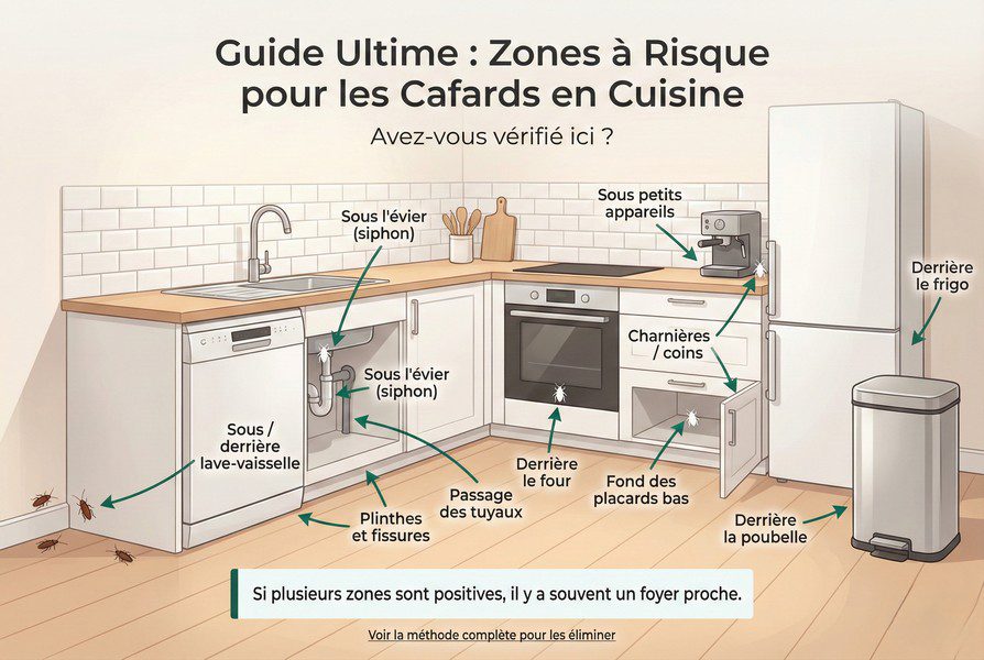 Où se cachent les cafards dans une cuisine (zones typiques + nid)