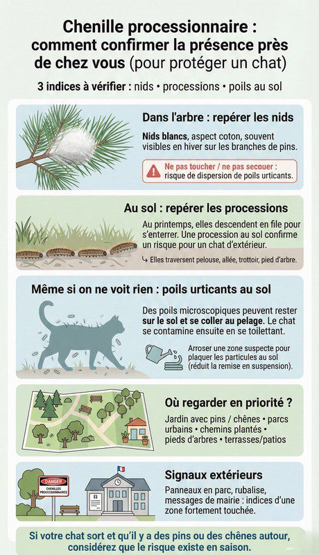 Quand un chat sort, la question n’est pas seulement “est-ce qu’il a touché une chenille”, mais aussi “est-ce que mon environnement en héberge”. Quelques signes concrets permettent de confirmer un risque autour d’un jardin, d’un parc, d’une résidence ou d’un chemin de balade.