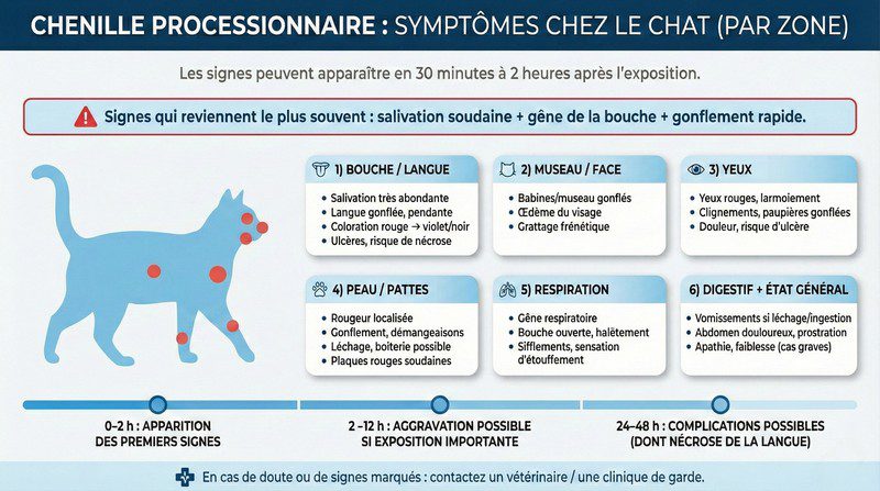 Quand plusieurs signes se cumulent chez un chat qui sort pendant la saison à risque, la suspicion devient forte, même si personne n’a vu la chenille. Le tableau typique associe une salivation massive, une gêne de la bouche, et une irritation localisée (museau, yeux ou patte).