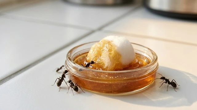Version pâte (plus efficace) : ajoutez 1 cuillère à café d’eau. La texture pâteuse colle aux pattes des fourmis — elles en transportent davantage vers le nid.