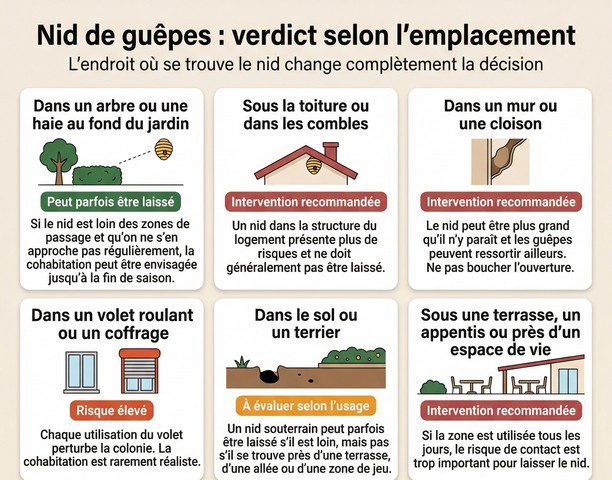 Le verdict dépend de la localisation précise : un nid dans un talus au fond du jardin peu fréquenté peut être laissé. Un nid sous la terrasse, dans le jardin des enfants ou à l’entrée de la maison impose une intervention.