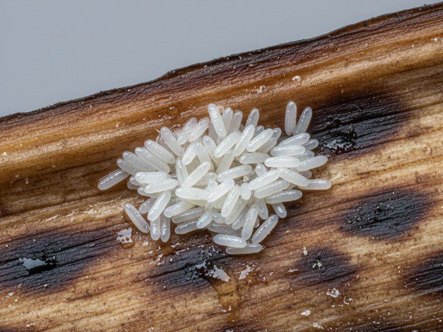 - Des grappes d’œufs blancs d’environ un millimètre, souvent collées sur un support humide ;
